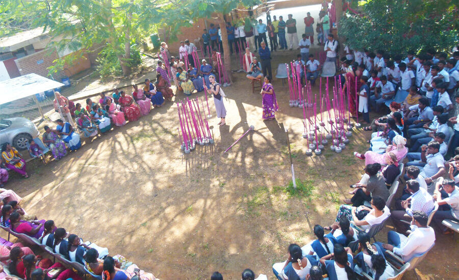 The project used collective making to address the taboo of violence against women and children. Students from AIAT and women from the Village Action groups co created a large scale installation of 365 pink bamboo sticks, each carrying an anonymous message in Tamil or English. The process engaged around 200 people, many from rural Dalit communities, and the work later toured in India and Germany. Shown in public space, the installation became a source of visibility and pride, strengthening participants’ confidence and sense of agency.